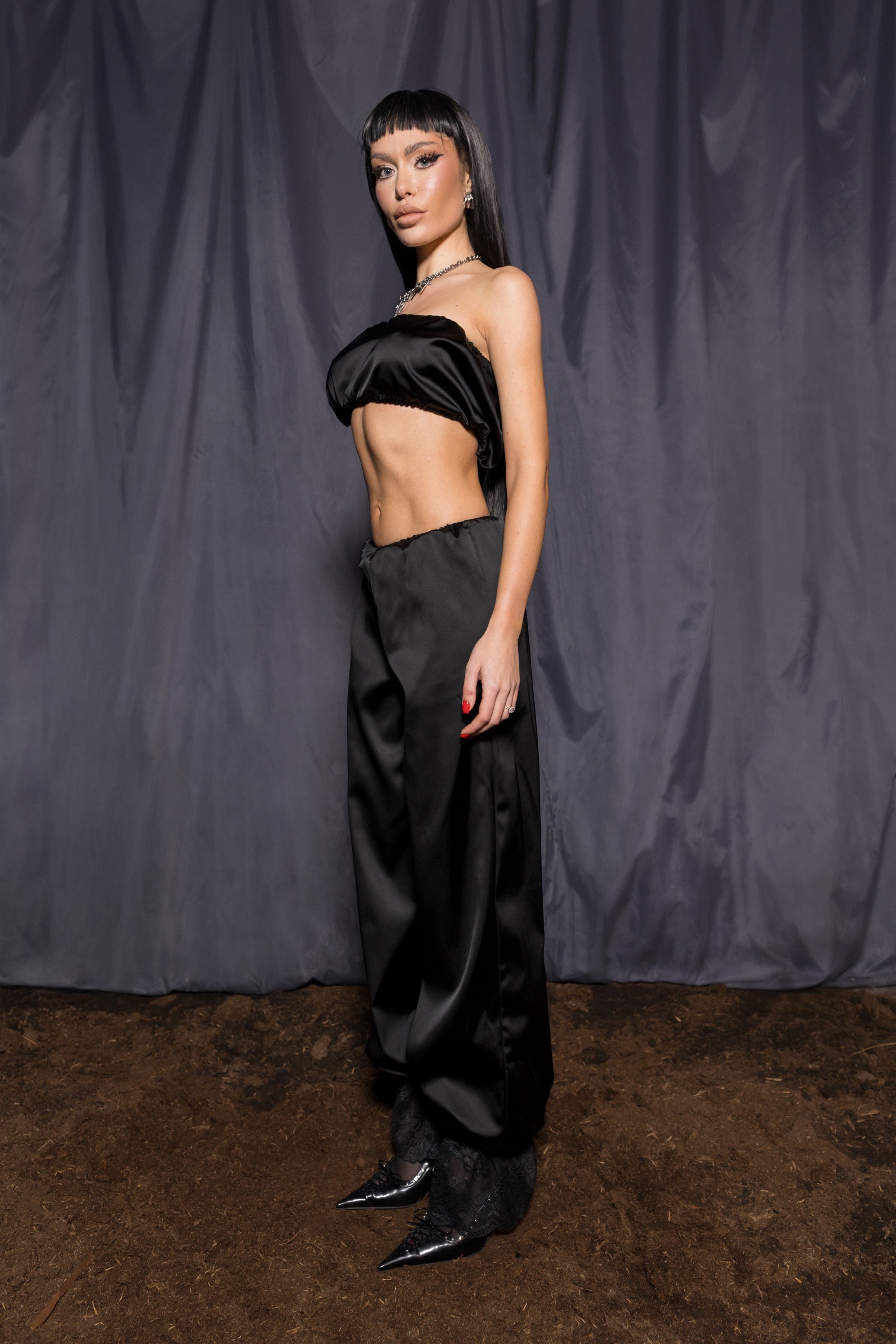 Two-piece set made from smooth satin, featuring a balloon bandeau top and matching balloon pants with lace-up back and stretch lace hems. Designed with a relaxed fit that shapes the body through movement modern, minimal, and confidently feminine.